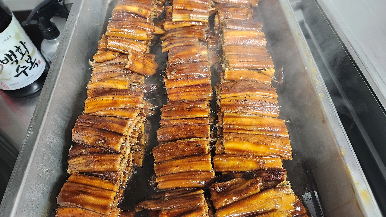 화구에는 커다란 냄비에 물을 끓이고 양조간장, 베트남 고추, 생강을 첨가하고 메추리알을 조려낸다. 평소보다 양조간장의 양을 늘렸더니 메추리알의 착색이 더 까마잡잡하게 이쁘게 나왔다. 팔팔 끓고 있는 메추리알을 뜰채로 4번 정도 바트(中, 용기)에 담아낸다. 장어의 느끼함을 잡아줄 식초에 절인 생강채(20kg)는 별도의 바트(中, 용기)에 담아두고 장어를 쿠킹 할 때 나온 장어소스를 빨간색 소스통에 채우면 대략 마무리된다.