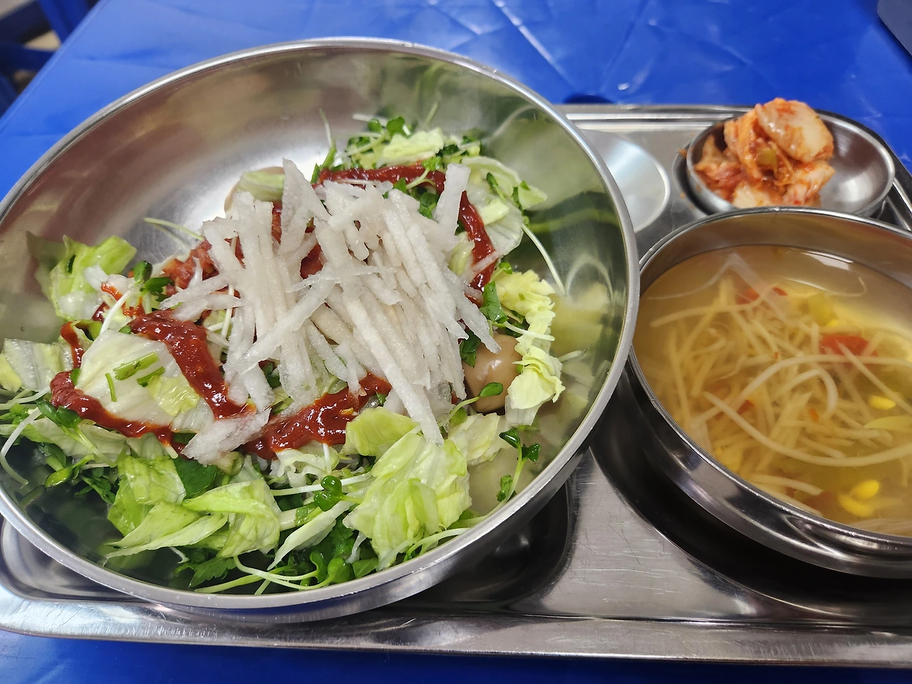 대형 냉장고에는 아침에 배송된 잘 손질된 육회(110kg)가 비닐에 싸인채 플라스틱 박스에 차곡차곡 쌓여있다. 조리 실장님으로부터 대략적인 조리법을 설명 듣고 머릿속으로 흐름을 숙지한다. '육회를 무침장에 무치고 바트에 담아내는 것' 까지가 조리실에서 우선 할 일이고 그다음은 배식대에서 야채, 배, 비빔장을 차례대로 넣어주면 된다.