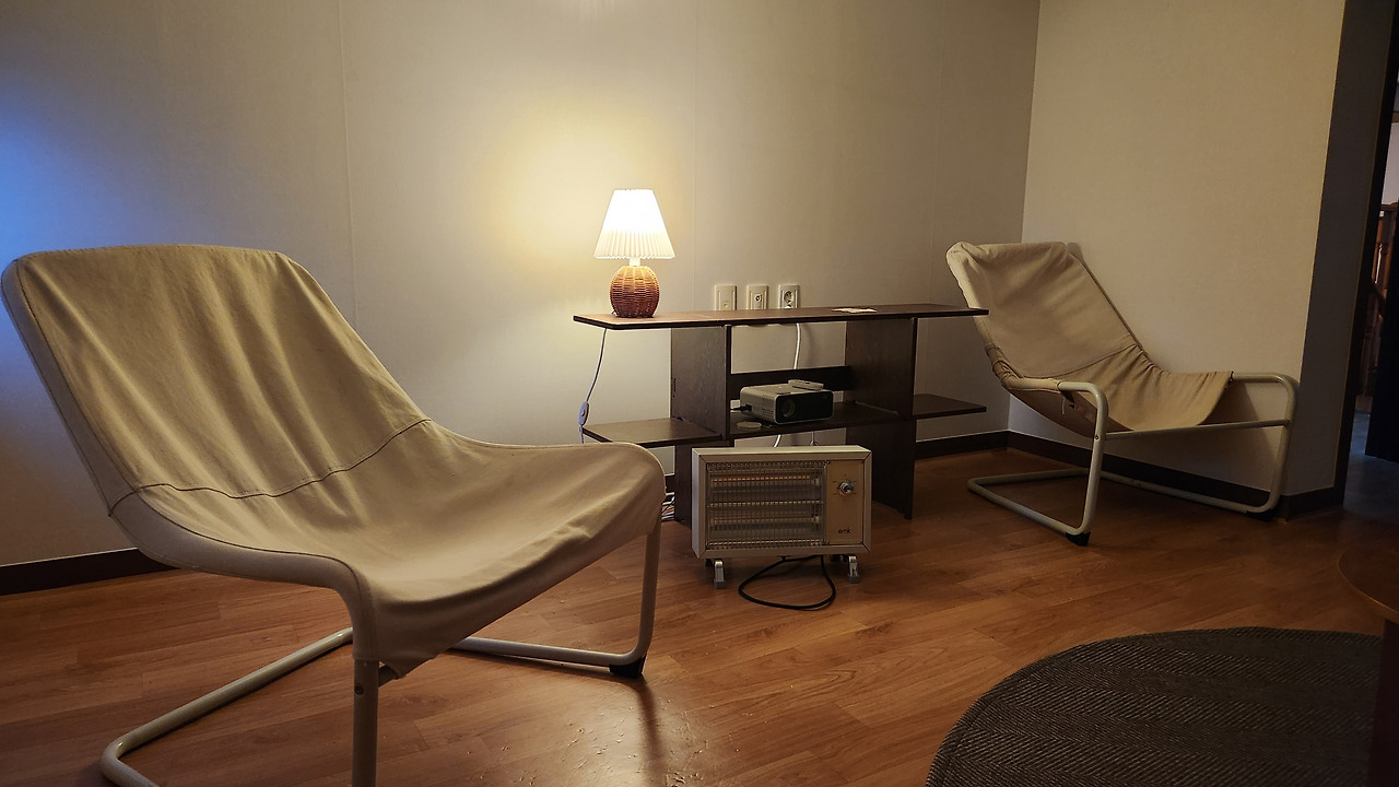 거실에서의 회합을 끝내고 커피 한잔씩을 테이크 아웃해서 2층 다락방으로 이동을 했다. 옆방에 있던 의자와 테이블, 소형 히터까지 동원해서 자리를 잡고 친구가 아이패드 플레이 버튼을 누른다. 그러는 사이 재빨리 스마트폰을 꺼내 분위기 있는 BGM을 구동시키고 벽면 화면 아래에 밀어 넣으니 어느덧 다락방은 소형 영화관으로 변신한다.