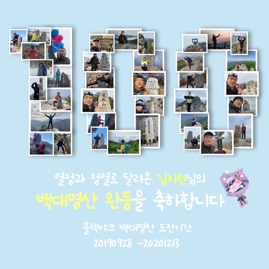2020.12.13 백번째 마지막 산행은 경북 구미의 금오산 이었다. 1년3개월만의 벅찬 감동이었다. 동네산을 주로 다니던 내가 전국 각지에 있는 명산들을 다녔다. 당연히 뱃살은 줄어들고 장단지의 근육은 단단해졌다. 하산후 각 지역의 맛집투어 와 향토 막걸리는 행복, 그 자체였다. 특히, 100번의 산행동안 함께 해준 산친구들은 소중한 나의 재산으로 남았다. 그들 덕분에 끝까지 완등을 할 수 있었고 기쁨은 배가 되었다. 다시한번 그들에게 감사하다는 말을 전하고 싶다.
