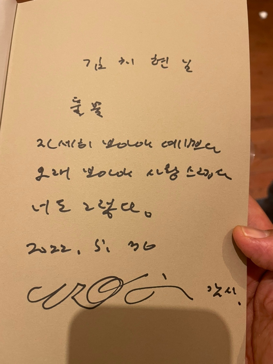 서점 입구에 놓인 <어느 날 예술이 시작되었다>를 저자 서명을 받을 요량으로 구입했다. 그런데 정작 책을 쓴 저자의 사인을 받는 것이 맞는 것인지, 아님 유명 시인의 서명을 받는 것이 맞는 것인지 약간은 혼동이 되었다. 동시에 유명 시인의 서명을 받을 거라면 집에서 시인의 시집을 가져왔어야 했는데 하는 후회가 되었다. 북토크는 저자인 고희정 작가의 책에 대한 이야기를 시작으로 진행되었다. 여러 방면의 예술가 8인에 대한 '처음' 예술의 시작부터 그들의 삶의 목표와 철학들이 인터뷰 형식으로 구성되어 졌다. 이어서 나태주 시인의 삶과 '시'에 대한 이야기로 이어졌다.