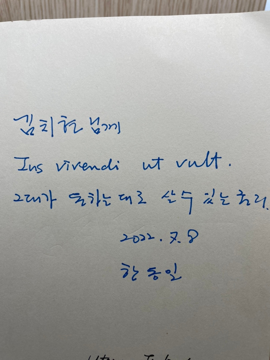 북 콘서트는 저자의 살아온 삶의 과정과 철학을 느낄 수 있는 시간이었고 독자들이 궁금해하는 것들을 상호 작용을 통해서 해소하는 장소가 되었다. 물론 그가 우스갯소리로 얘기했던 인간의 탁월한 능력인 ' 한 귀로 듣고 한 귀로 흘려보낸다'라는 것이 남 얘기는 아는 듯했다. 어느 여름날에 같은 공간, 같은 시간에 만난 작가 ' 한동일'이라는 사람의 삶의 철학을 백 프로 이해하지는 못하겠지만 왠지 두시간의 짧은 시간을 통해서 내 안에 삶에 대한 자신감이 높아진 듯한 느낌이다. 그가 나의 책에 써준 문구처럼 남은 생을 후회없이 도전하면서 계속 앞으로 나갈 것이다.