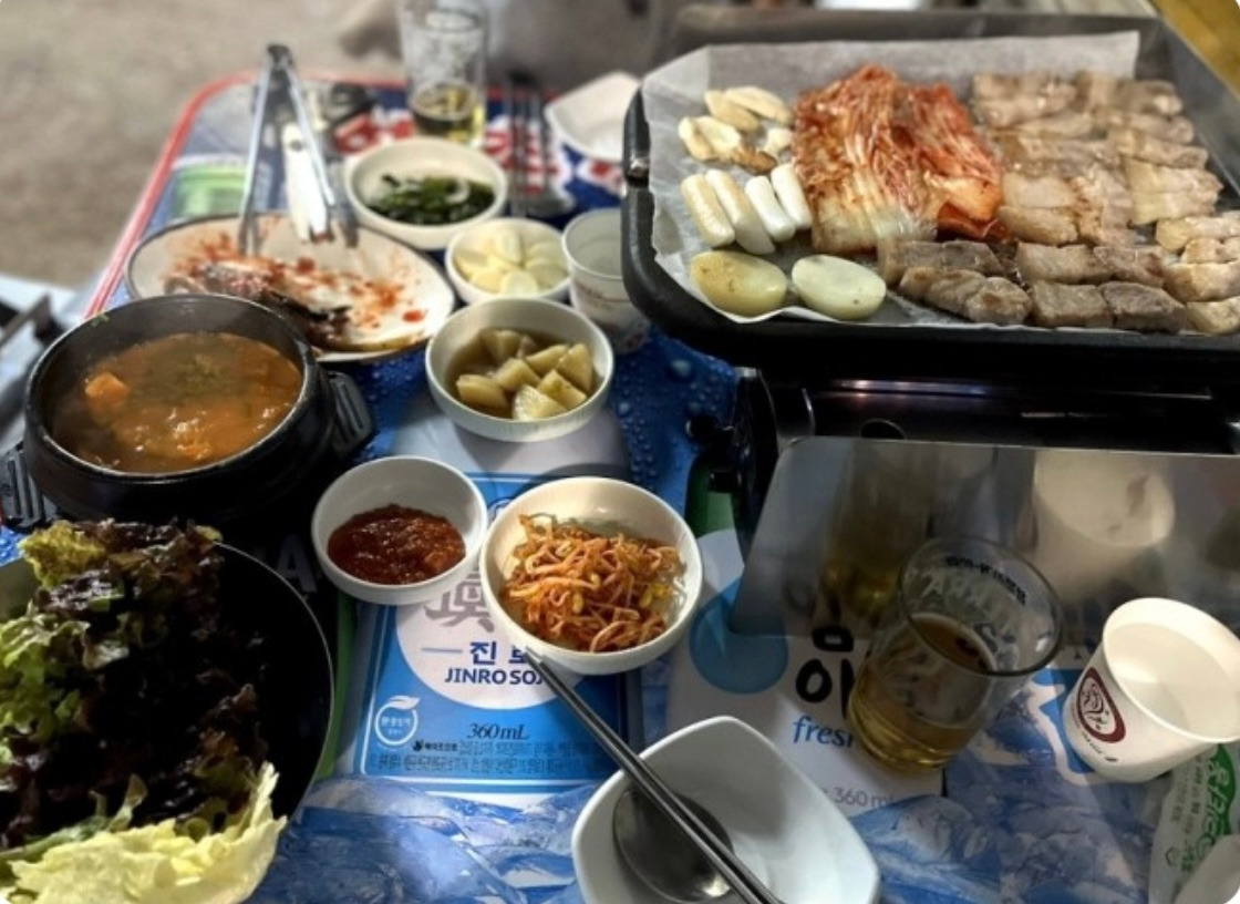 삼삼오오 젊은 MZ들이 주로 삼겹살에 소주, 된장찌개나 냉면을 먹고 있었다. 신선한 충격이었다.