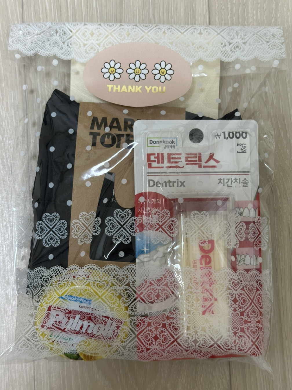 또 한 친구의 선물은 이쁜 장바구니 가방과 입가심 레몬사탕, 치실세트, 비타민 C 가루, 이쁜 봉투 3종이었다.