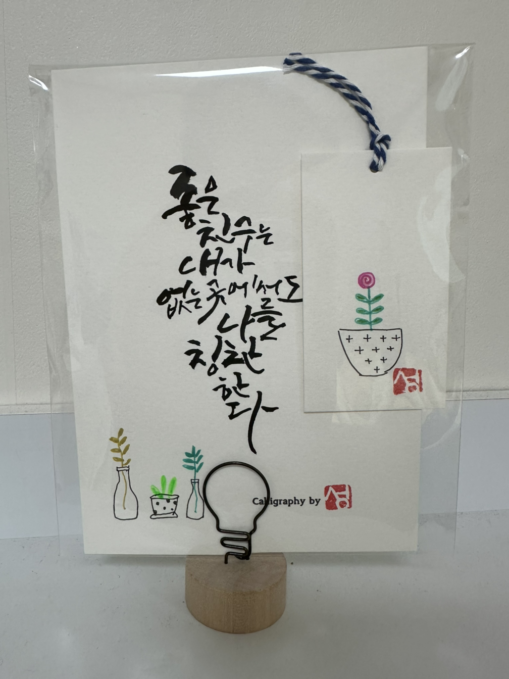 천안 친구가 준 것은 본인이 직접 쓴 캘리그래피 문구와 책갈피 그리고 종이를 세울 수 있는 받침대였다.