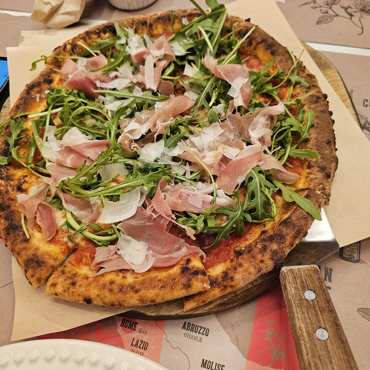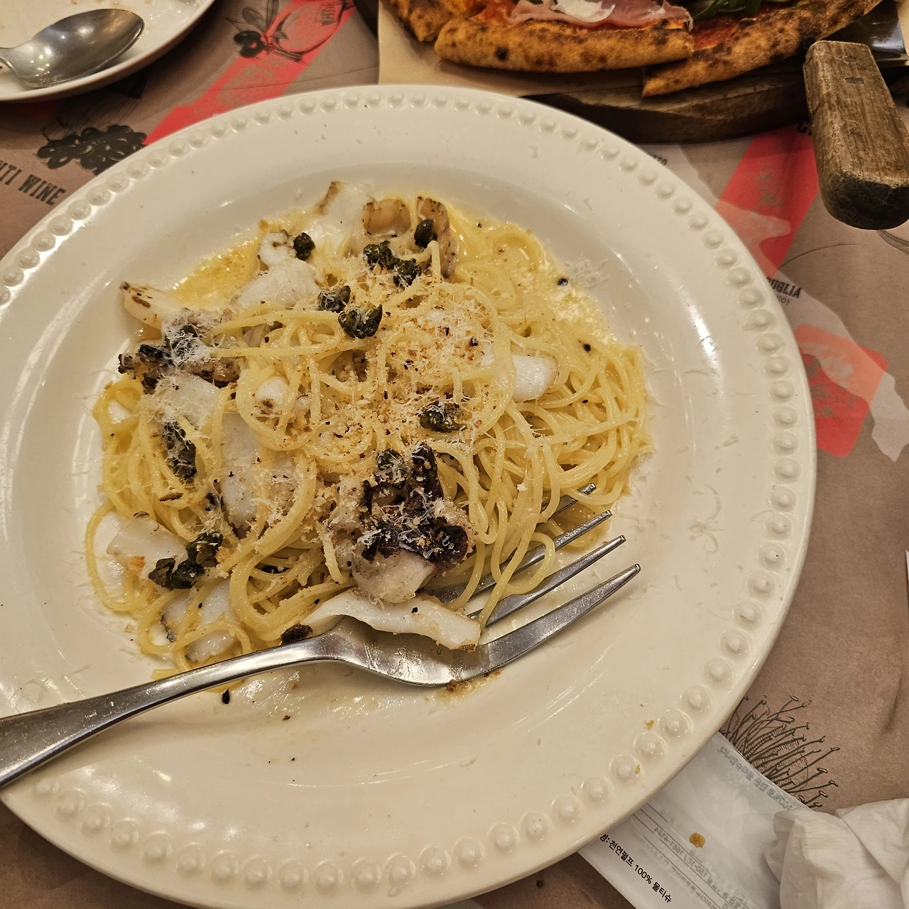 갑오징어 파스타, 루꼴라 프로슈토 피자가 3-4인 런치세트로 있어서 스테이크가 들어간 샐러드를 하나 더