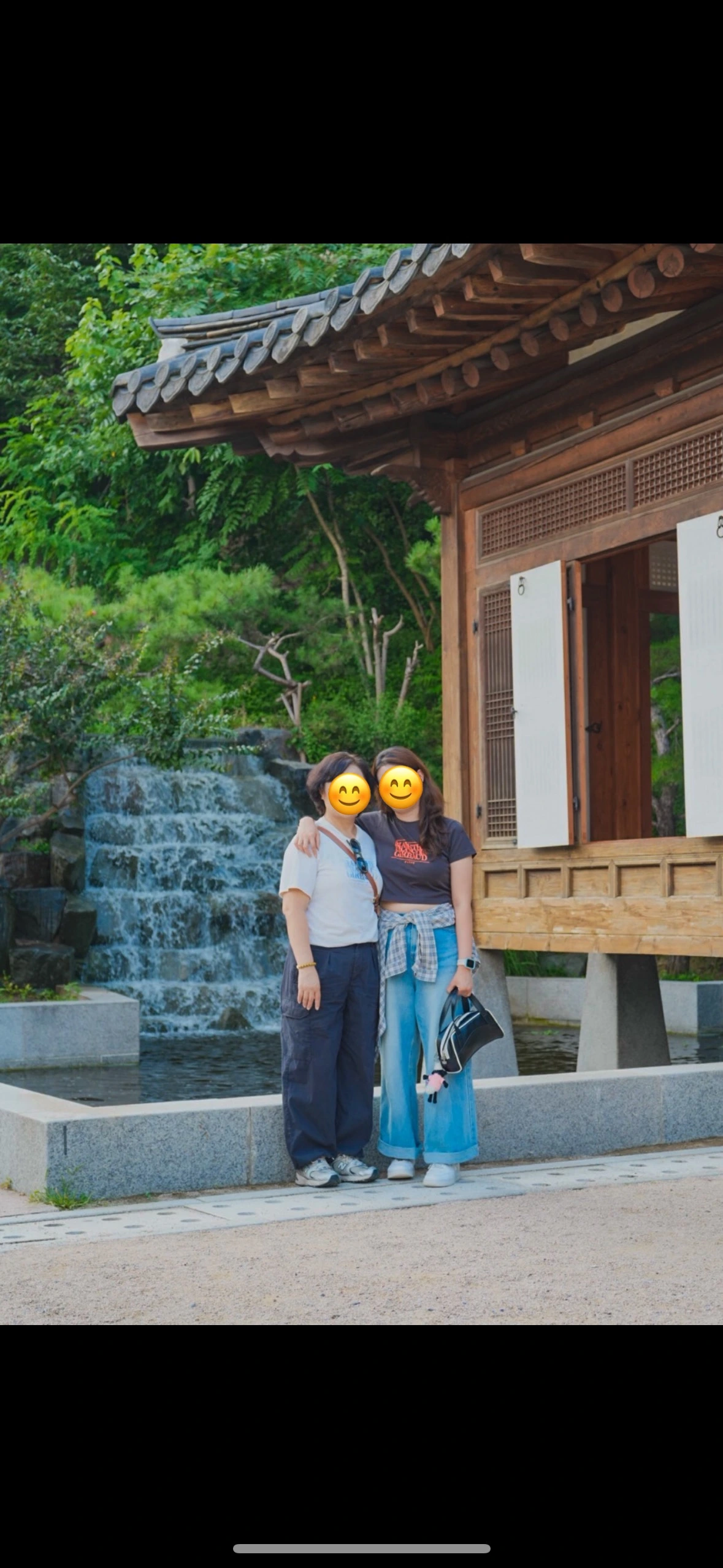 나와 딸은 정자 앞에서 폭포를 배경 삼아 사진을 찍었다. 행복했다.