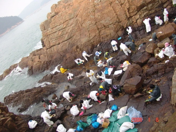 우리 교회에서 대절한 대형 버스는 20대가 넘었다. 새벽 6시에 버스는 겨울바다를 향해 떠났다. 몇 시간을 달려 만리포 해수욕장에서 조금 떨어진 해안에 도착했다. 현장에서 우주복처럼 생긴 옷을 받아 옷 위에 입었다. 얼굴은 마스크로 가리고, 손에는 기다란 주황색 고무장갑을 끼고, 장화를 신었다. 사고가 난 지 일주일이 지났지만 기름 냄새가 지독하고, 바위와 돌들은 기름에 덮여 있었다. 다행히 바다에 있던 기름은 많이 제거된 후인지 검은 파도는 아니었다.