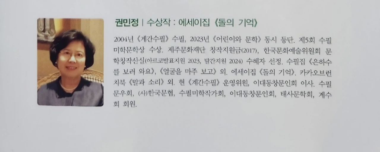 제43회 현대수필문학상 시상식이 3월 28일, 국방컨벤션에서 있었습니다. 올해는 3명의 작가가 수상했는데 제가 영광스러운 수상자 중 한 명으로 뽑혔습니다. 2024년 10월에 출간한 저의 에세이집 《돌의 기억》으로 수상했습니다.