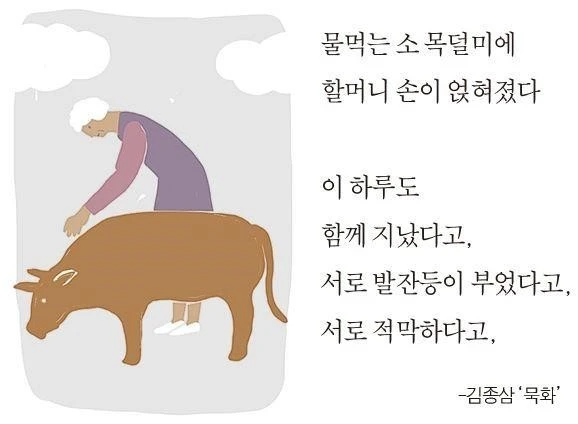 세 번째 가장 다정한 모습으로 다가오는 한 할머니의 모습이 있다. “물 먹는 소 목덜미에/ 할머니 손이 얹혀졌다./ 이 하루도/ 함께 지났다고,/ 서로 발잔등이 부었다고,/ 서로 적막하다고,”(김종삼의 '묵화') 시인이 쓴 시에서 나온 할머니이니 허구의 인물 아니냐고 할지도 모른다. 그러나 나는 거친 손을 소 목덜미에 대고 수고했다고 말하는 할머니를 알고 있다. 우리 할머니들이다. 부지런하고 따뜻하셨던 할머니. 삶이 무르익고 깊어져 남을 생각할 줄 아는, 세월이 주는 가장 큰 선물인 그 기품을 가진 할머니다.
