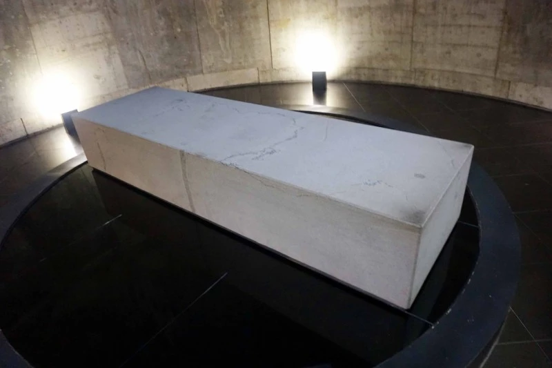 4·3 평화기념관 제 1 전시실 동굴 입구를 들어서면 둥근 원형의 벽으로 둘러싸인 공간이 있다. 천정으로부터 외부의 빛이 쏟아지는데 방한가운데에는 비문이 새겨지지 않은 백비가 누워있다. 아직도 백비로 남아있는 까닭은 4·3 이 아직 제 이름을 갖지 못했기 때문이다. 훗날 언젠가는 누워있는 비석이 세워지고, 비문이 새겨질 것으로 믿는다.