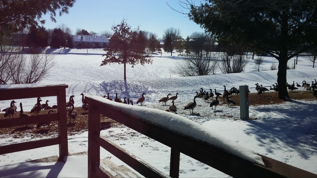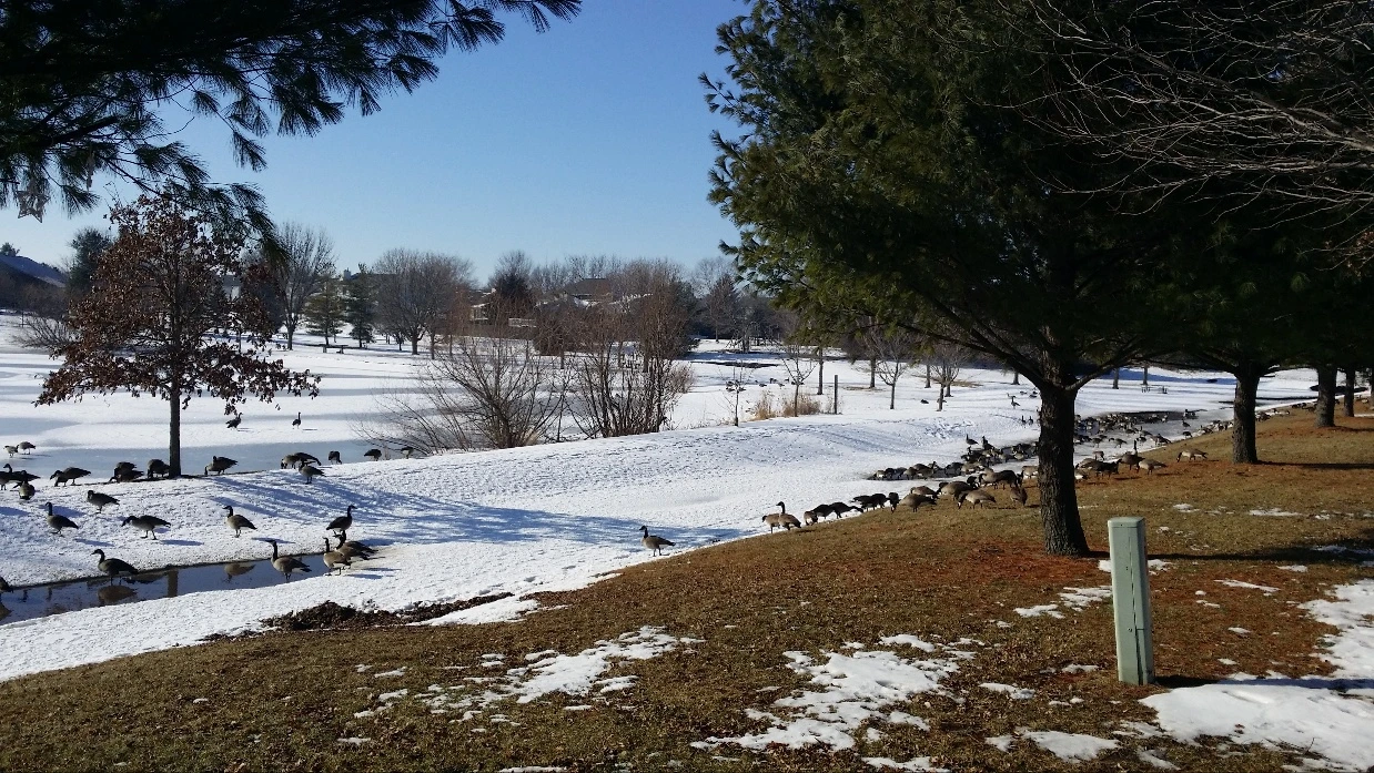 오후 2시경, 영상의 온도에 나무 밑의 눈이 다 녹고 풀밭이 거의 드러났다. 이 도시 거위가 다 몰려오는 듯 자꾸자꾸 어디선가 날아온다. 300~400마리는 될 것 같다. 호수의 눈도 많이 녹아 그곳은 하늘빛을 닮아 푸르스름하다. 수백 마리의 거위들이 풀밭에서 열심히 풀을 뜯고 놀고 있는 모습이 푸른 들판에 양 떼들 같다. 정말 아름답다. 평화로운 들판에서 풀을 뜯고 있는 수백 마리의 양 떼를 보는 듯, 전원교향곡 5악장의 폭풍우 후 다시 평화를 찾은 자연의 장엄한 음악 소리가 들리는 듯 한순간 환상에 빠진다.