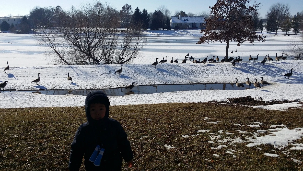 이 층에서 잠시 아기를 돌보고 내려오니 집 앞 호수 조금 못 미쳐 있는 조그마한 도랑에 어느새 거위 30~40마리가 와 있다. 물이 얕고 흐르던 물이라 녹았는지 종지 물 같이 조그마한 웅덩이가 생겼다. 그 좁은 웅덩이에서 싸우지 않고 차례차례 물을 마시고 물속에서 먹이를 찾고 있다. 거위는 평화를 사랑하는 종족인 것 같다.