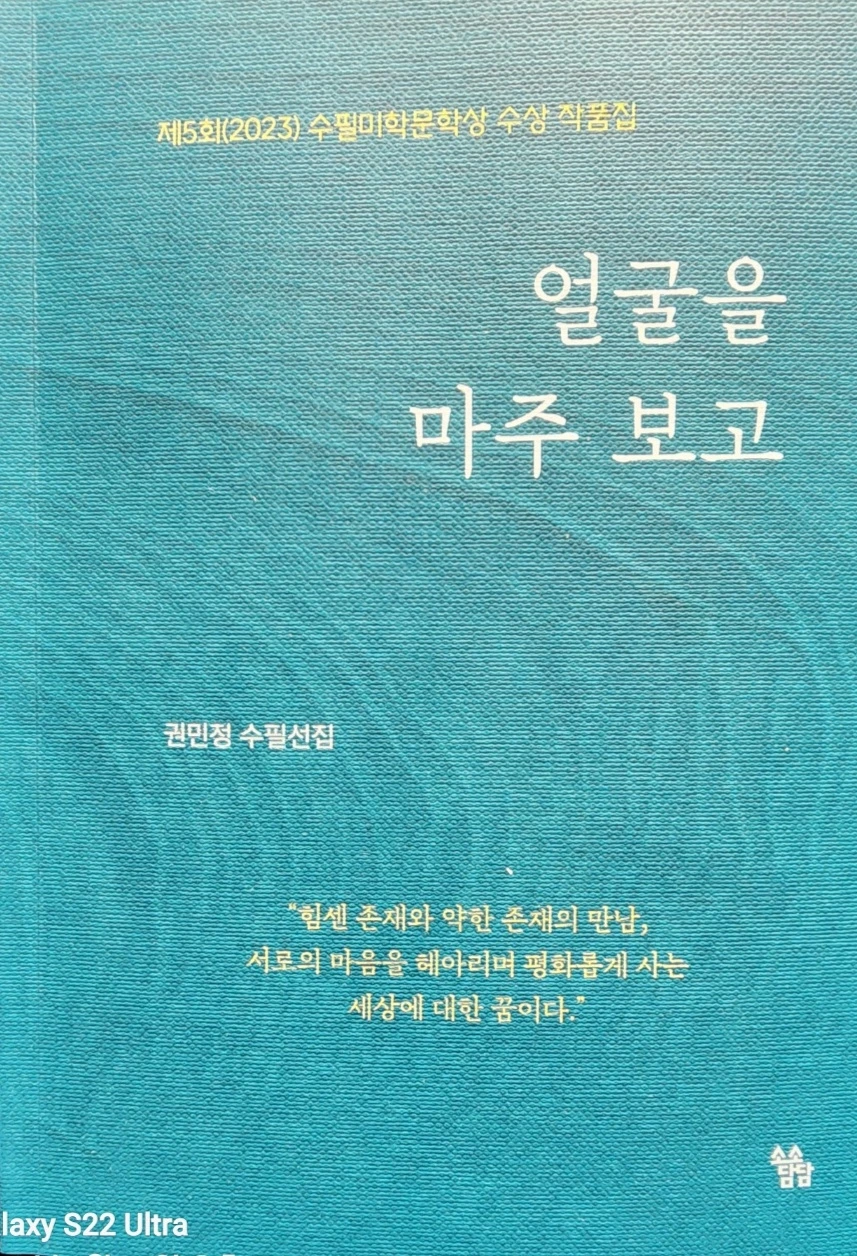 권민정의 수필 선집 《얼굴을 마주 보고》는 기꺼이 문학의 소명을 감수하고 이행한다. 작가는 세상의 그늘을 응시하고 그 불균질한 틈새를 사유하며 자기 삶을 성찰한다. 불화하고 불평등한 삶의 부조리를 파고들어 어떤 방향성을 모색한다. 힘센 자와 약한 자가 서로를 헤아리며 평화롭게 공존하기를 꿈꾼다. 세상을 향한 그의 시선은 연민으로 가득하고, 그가 써 내려간 문학의 순간들은 아프면서도 따듯하다.