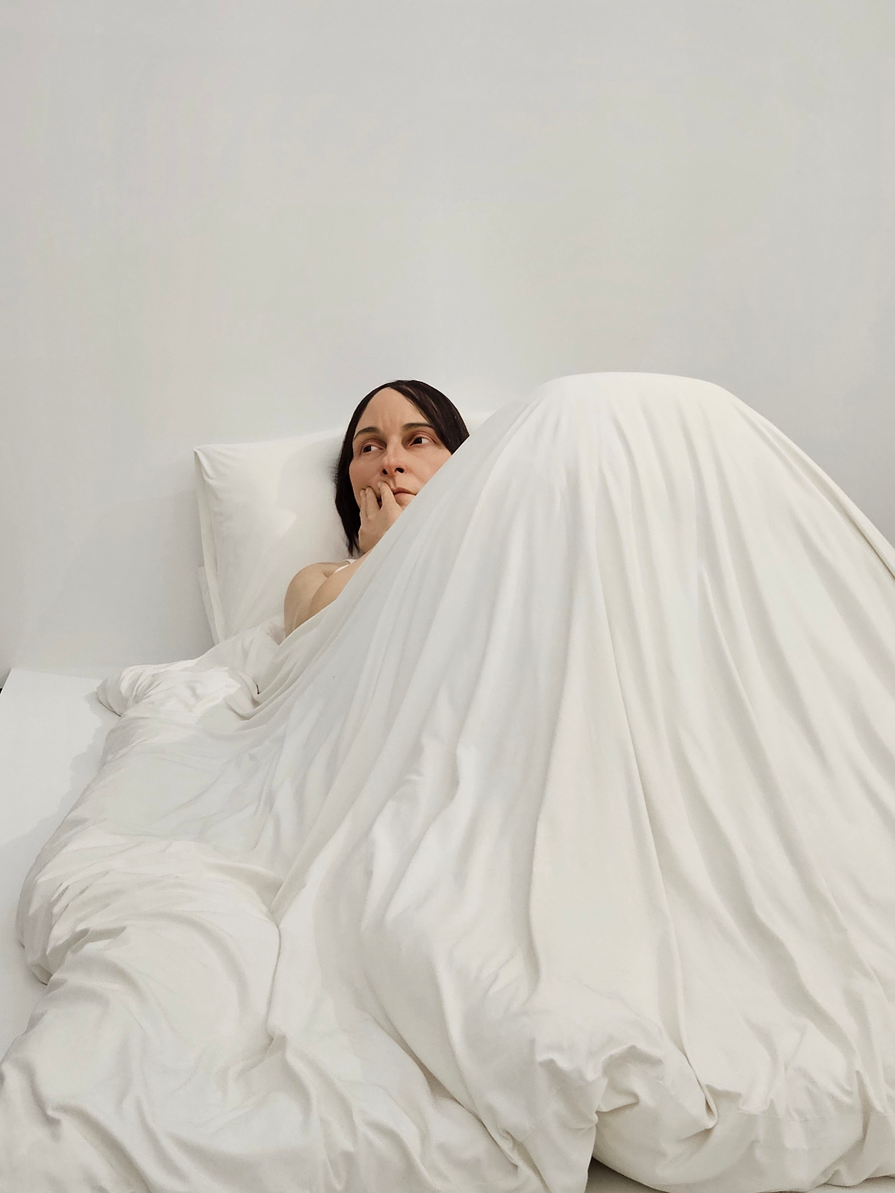 론 뮤익의 대표작으로 〈마스크II〉를 꼽을 수 있지만, 이번 전시에 〈침대에서〉는 관람객들의 높은 관심을 받았다. 〈침대에서〉는 작품 제목처럼 실제와 흡사한 책상에 여성이 반쯤 기대 누워있는 모습을 묘사하고 있다.