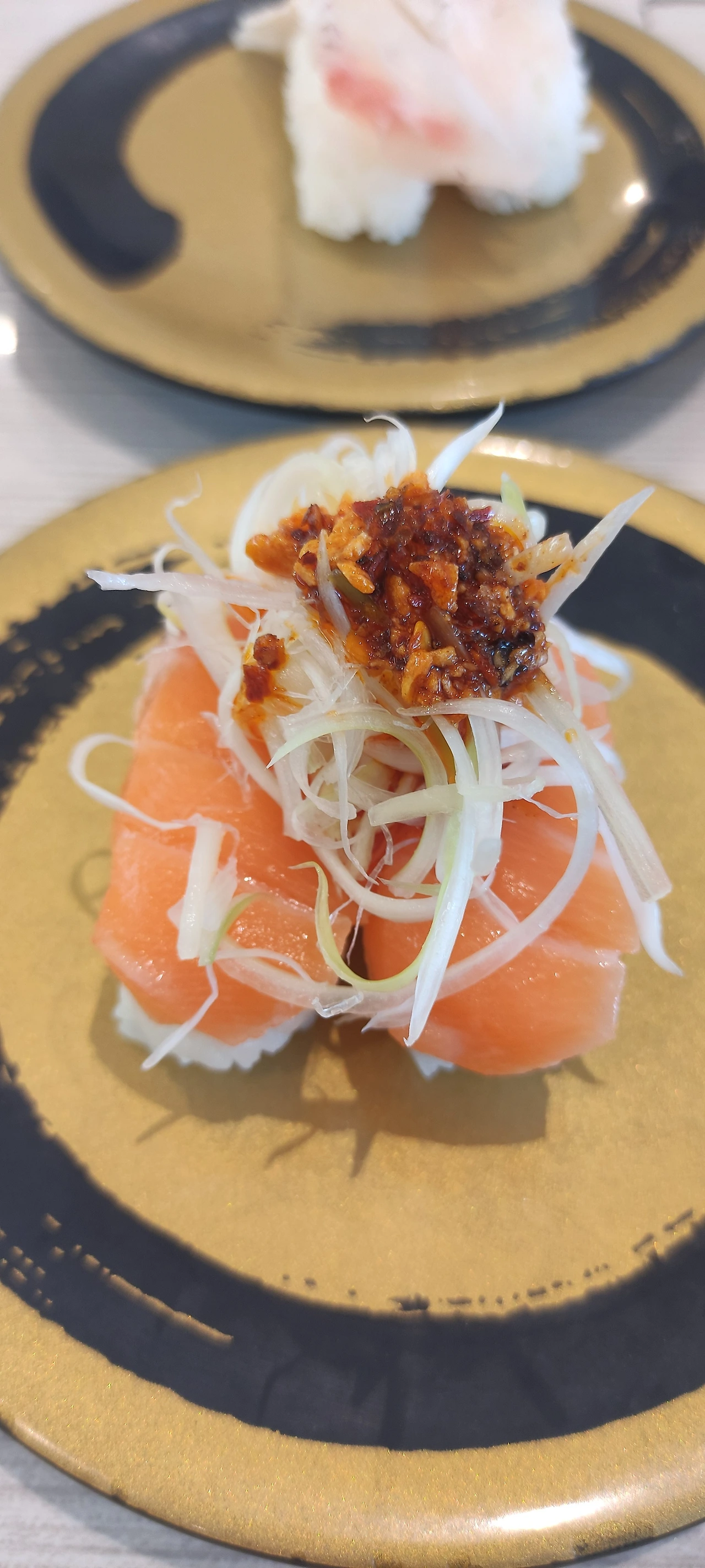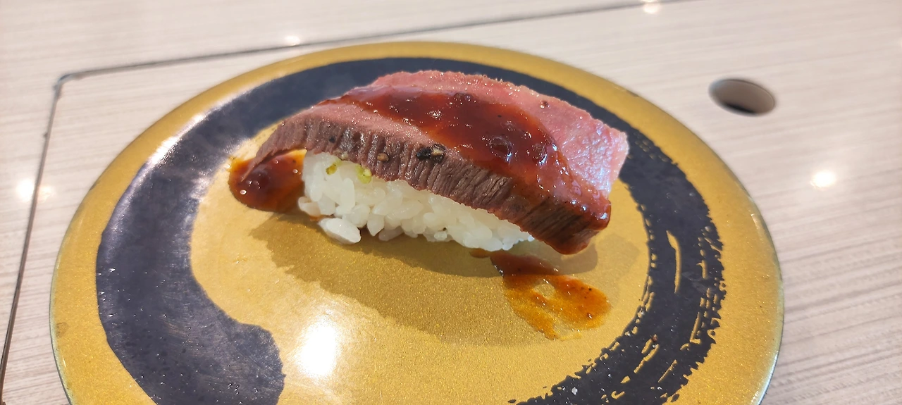 보통 스시 한 접시에 100엔 비싼 건 150엔 정도 한다.