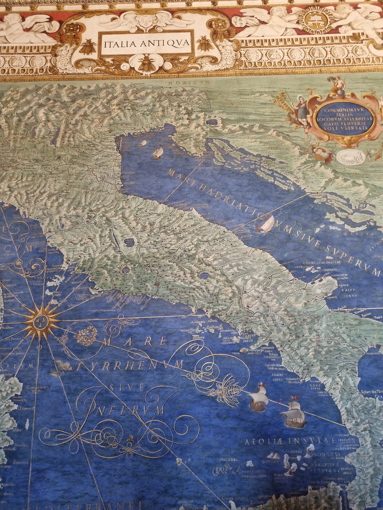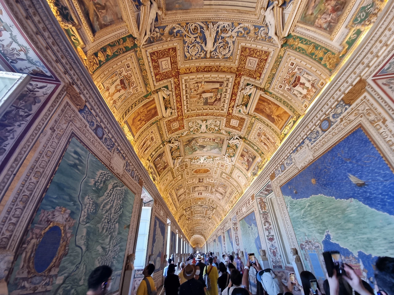 지도의 회랑은 이름에서도 알 수 있는 지도들이 가득한 방이다. 지도에 관심이 많은 나에겐 조금은 위로가 되는 부분이었다. 이곳은 부동산에서 자주 볼 수 있는 지역구 지도 정도를 생각하면 편하다. 교황청에 걸려있는 지도라면 하면 어떤 지도이겠는가? 아무래도.. 교황청과 관련이 있는 지도일 테고 그렇다고 하면... 교회가 있는 곳의 지도일 것이다. 주로 교황의 영향력이 강하거나 혹은 교회가 위치하여, 교황이 위치를 알아야 하는 곳들을 위주로 지도로 그려져 있다. 여기까지 바티칸 박물관을 구경했다면 잊지 말고, 천장을 바라보는 것은 습관이 되었을 것이라고 생각한다. 물론 너무 화려하기 때문에 지친 고개와 눈이 자동으로 천장을 보게 될 테니 못 보진 않을까 걱정을 크게 안 해도 괜찮다.