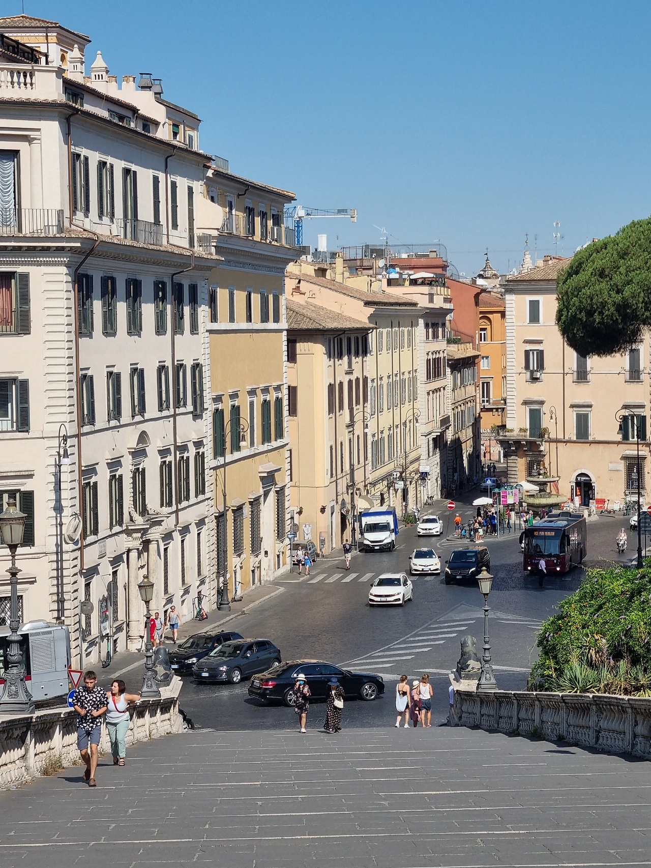 이 광장이 높이 있는 만큼 내려갈 때의 풍경 또한 매우 장관이다. 로마의 디자인과 어우러지면서 더 큰 효과를 불러온다. 내려가는 길 또한 상당히 과학적인 요소들이 담겨있다고 한다. 계단의 폭과 올라갈 때와 내려갈 때 보이는 각도를 조절하여, 올라갈 때 계단이 완만해보이게 설계했다고 한다. 여기까지 투어를 본 후 우리는 우리를 기다리는 프란체스코 기사님의 벤으로 다시 향했다. 창문을 통해 보이는 로마는 보면 볼수록 더 매력적으로 나에게 다가왔다.