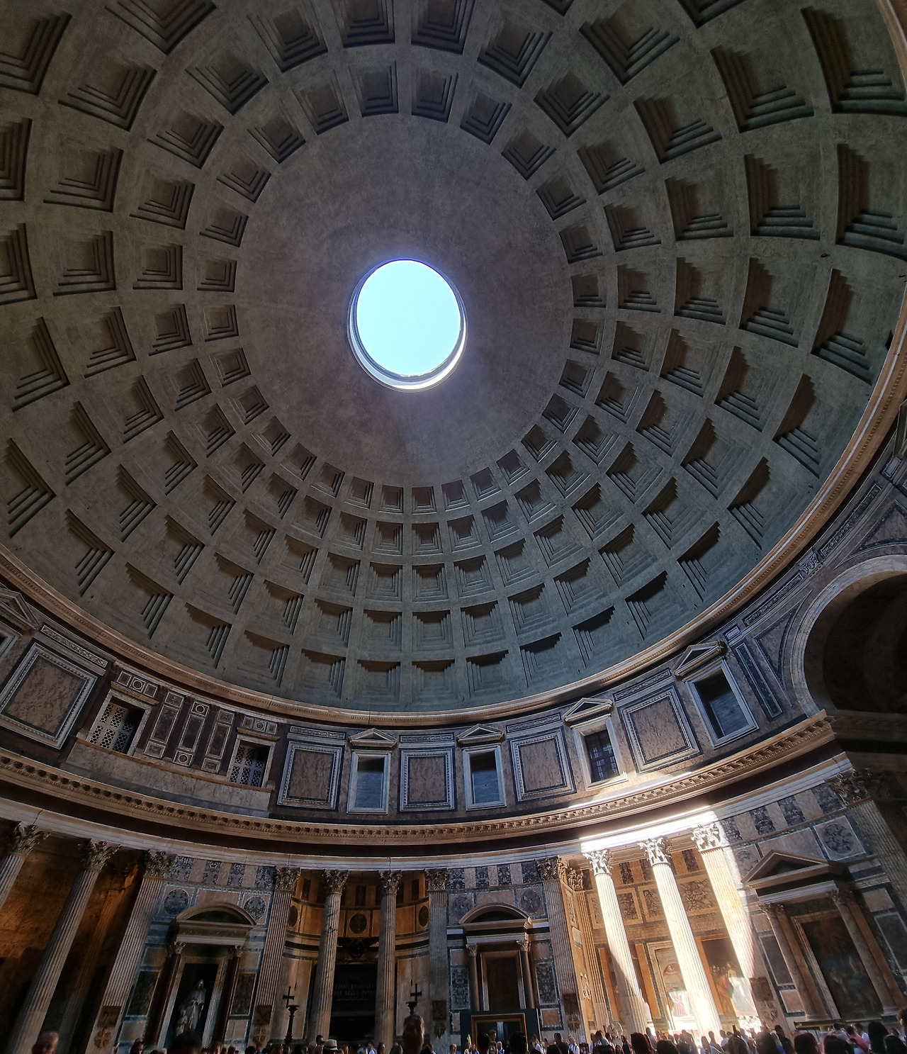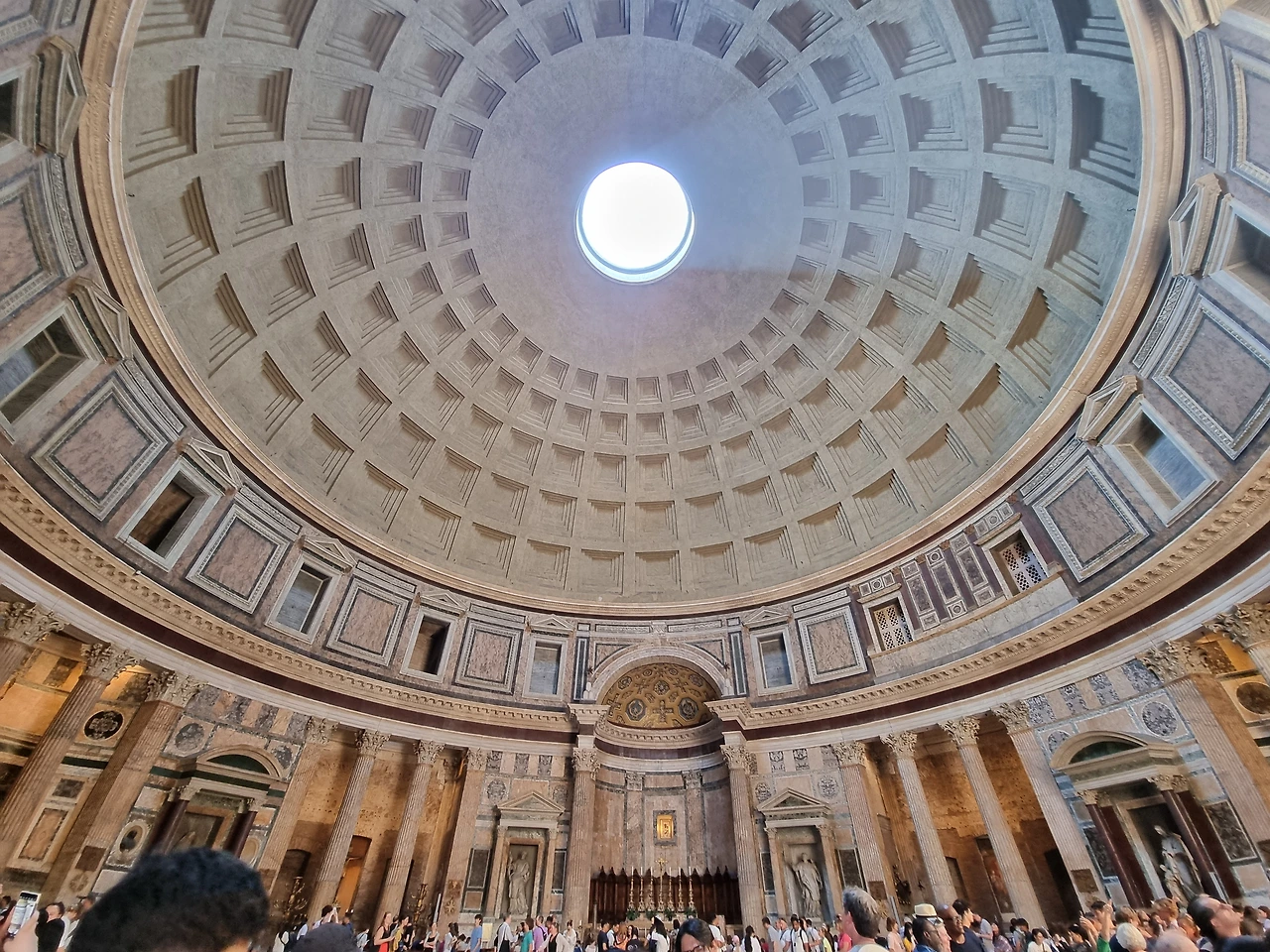 이러한 위험을 무릅쓰고 판테온에 들어가자마자 내 눈에 들어온 것은 당연하게도 저 거대한 돔과 구멍이었다. 구멍의 뚜껑은 없으니, 천장을 통해 비라도 들어오면 어쩌지 싶었지만, 뜨거운 열기가 오히려 구멍을 통해서 나가는 방향이 형성되어 있기에 비가 들어올 수가 없다고 한다. 이런 건물을 만들다니 정말 대단하다.