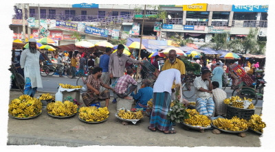 가르시아는 작은 곳이 아니었다. 큰 로터리를 가진 도시, 도로 위로 고가도로가 있는 도시다. 내리자마자 시장이 형성돼 있었다. 지역 농산물들이 모두 이곳에 모이는 것 같았다. 해수욕장의 비치볼처럼 싸놓은 수박은 베개로도 사용할 수 있을 만한 게 길쭉하게 생긴 것도 있다. 도로 중앙 분리 구역에 자리 잡은 과일상은 노란 바나나를 야구 글러브 펼쳐놓은 듯 죽 늘어놓았다. 멀리서 보면 봄 유채꽃 밭을 보는 것 같다. 상가 쪽 인도를 점령한 상인들은 금방 따서 반짝반짝 빛나는 푸른빛과 붉은빛이 섞인 토마토, ‘나 오렌지색이 당근’이라는 것을 알려 주기 위해 흙을 떨어냈을 당근, 작은 것이 맵다는 진짜 매운 새끼손가락 두 마디만 한 파란 고추, 길쭉한 것, 동그란 것 모두 한 가지라는 듯 중앙을 차지한 보랏빛 가지, 통통한 것이 ‘손 지압기’라 해도 믿을 연녹색 여주, 반을 떡 갈라 배알 있는 놈이요 하며 진노랑 뱃속 씨앗까지 훤히 보여주는 호박, 그리고 내가 아직 이름을 모르는 녹색의 채소들을 밴(VAN) 위에 싸놓고 손님을 기다렸다. 4톤쯤 돼 보이는 짧은 축의 트럭에서는 바나나를 내리느라 분주하다. 트럭의 짐칸 높이는 사람 머리보다 높다. 어른 팔뚝만 한 줄기에 줄 맞춰 송이를 맺은 바나나를 내리는 중이다. 한줄기에 대여섯 송이, 7~80개의 바나나가 달렸다. 트럭 위에서 내려 주는 사람은 아래에서 받는 사람 머리에 2줄기를 올리고, 하나는 어깨에 올려주었다. 한 몸에 실어 나르는 바나나는 200여 개다. 내릴 때는 높은 곳에서 낮은 곳으로 내리니 쉽겠으나 실을 때는 어찌했을고 생각했다. 그들의 수고로움으로 도회지에 사는 사람들이 바나나를 아주 싼값에-방글라데시에서는 바나나 낱개 하나에 5따카(60원) 정도 한다-먹을 수 있는 것이겠지 생각했다.