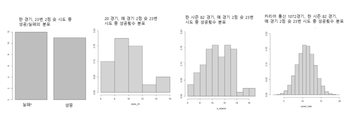 마이클 조던의 정규시즌 경기의 횟수가 1번, 20번, 82번, 그리고 1072번으로 증가하면서, 슛 성공과 실패의 두 값만 갖던 분포가 점점 변하여, 분포의 봉우리와 꼬리가 생기고, 봉우리는 가운데로 옮겨가고 양쪽 꼬리는 점점 얇아진다. 맨 왼쪽 성공과 실패 두 값만 표현하는 그래프의 이름이 베르누이분포이며, 가운데 둘은 이항분포, 맨 오른쪽 종모양으로 부드러운 곡선을 이루는 그래프의 이름이 가우스분포 또는 정규분포이다.