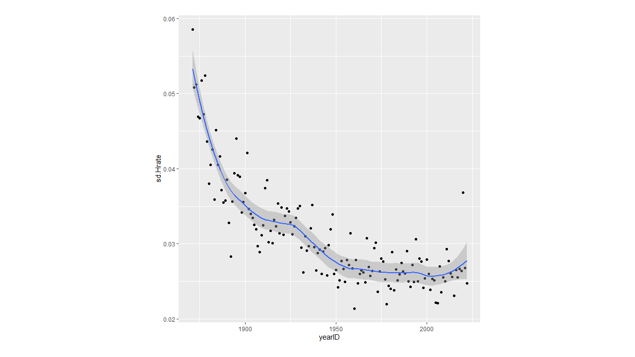 그리고 해마다 선수들의 타율 표준편차를 계산해서, 그래프로 그렸다. 아래 그림2는 굴드가 사망한 2002 년 이후 데이터도 포함해서 같이 그렸다. x축은 해이고, y축은 그 해 선수들 타율의 표준편차이며, 해가 갈수록 편차가 즐어드는 걸 볼 수 있다. 즉, 초창기일수록 잘 하는 선수와 못하는 선수들의 차이가 크고, 요즈음일수록 잘하는 선수와 못하는 선수들의 차이가 줄어든다.