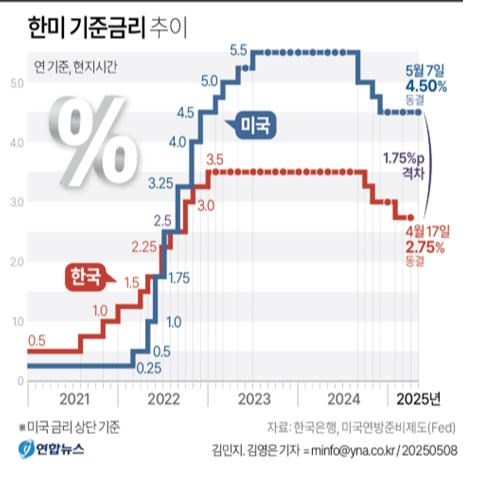 항간에서는 꽤 오래 지속된 한미 금리 역전(그림3)과 M2 통화량 증가가 결정타로 꼽힌다. (2026년 1월부터 M2에서 수익증권이 빠진다.) 또 국민연금 같은 큰 기관의 해외투자, 미국 관세발 대규모 대미투자, 기업들의 해외직접투자(FDI)와 환전 지연, 미국 증시에 투자하는 서학개미도 환율의 적으로 뽑혔다.