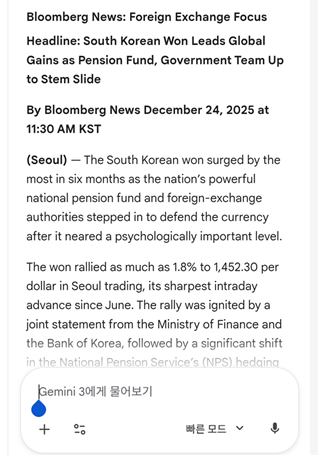 연말 휴가를 앞둔 크리스마스 이브에 결국 1482원을 넘기자, 갑자기 환율이 거짓말처럼 계단모양으로 뚝뚝 떨어지기 시작했다 (그림5). 남들도 보고 있었는지, 블룸버그 통신이 국민연금과 정부조직 덕분에 '미세한 조정(operational smoothing)'이 있다고 보도했다(그림 6). 놀란 개미들이 은행으로 달려가서 또는 은행앱이나 증권사 앱으로 달러를 사기 시작했다.