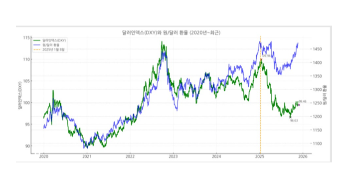 보라색 원달러환율과 초록색 달러인덱스 그래프를 보면, 둘이 붙어다니다가, 2024년 중순부터 틈이 벌어지기 시작하더니, 2025년에는 아예 헤어졌다 (그림2).