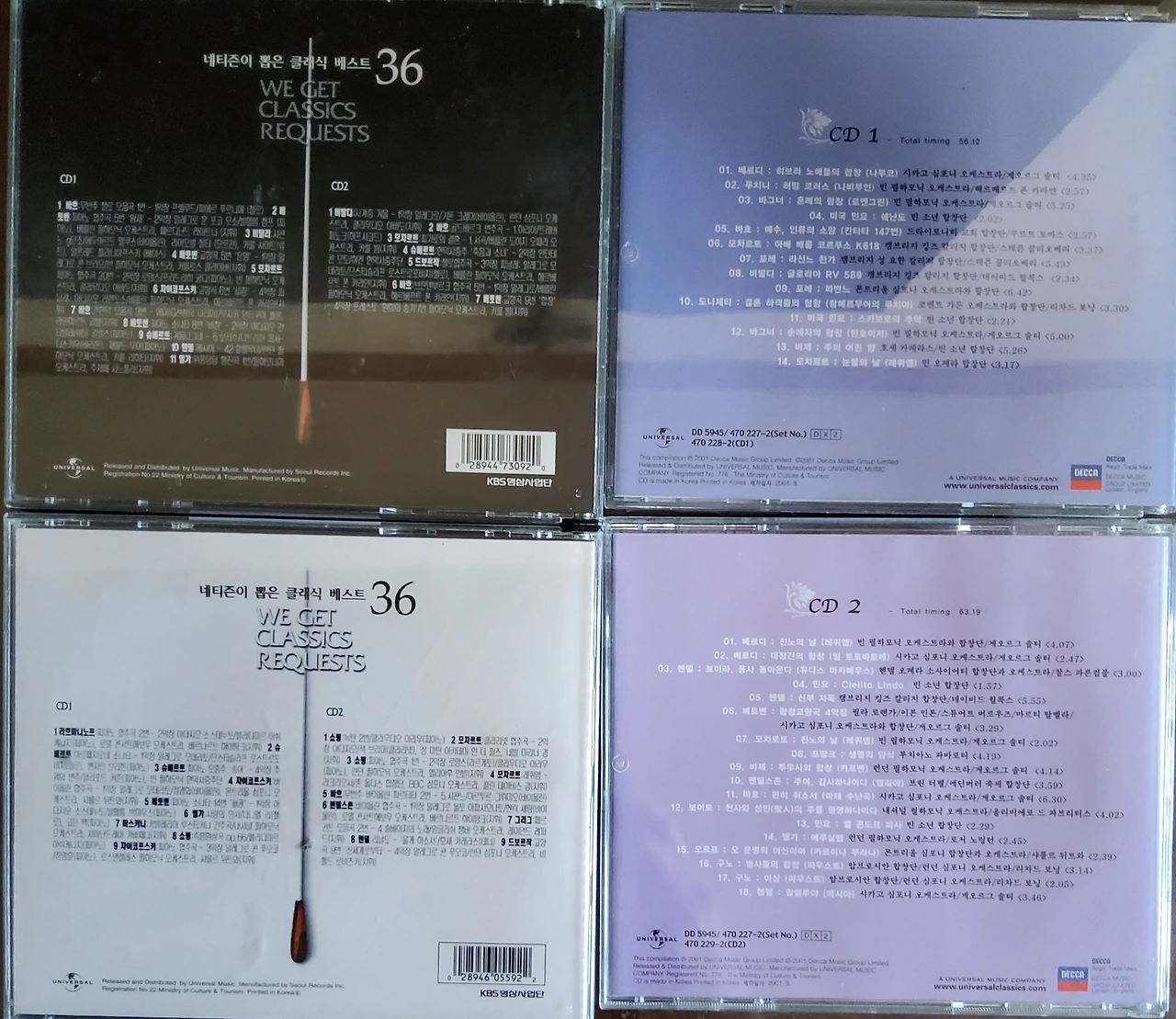 * FM 93.1 20주년 앨범 시리즈 We get classics requests 1 (2000),2,3 명곡 명연주를 모아뒀고, 음질도 좋은 편이라서, 클래식 입문하기 딱 좋은 CD이다.