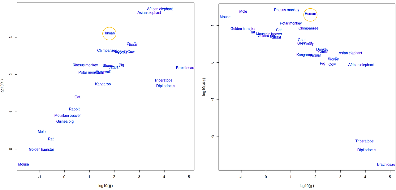 공짜 통계 소프트웨어에서 인간을 포함한 28 종류 동물의 몸무게와 뇌무게가 포함된 데이터를 만났다. 평소 동물의 왕국을 즐겨보던 터라, 몸과 뇌의 관계를 그래프로 그려봤더니, 뇌가 작아서인지 일찌감치 멸종한 공룡 빼고, 몸무게와 뇌무게가 비례하며 일직선에 놓였다 (그림 1). 몸이 작아질수록 뇌는 작아지고 몸집 대비 뇌의 비율은 커지면서, 작고 효율적인 뇌가 된다는 할러의 규칙이 잘 보였다 (그림2). 인간의 뇌는 코끼리에 이어 두 번째로 크고, 몸집에 대한 뇌의 비율은 붉은털 원숭이나, 두더지, 생쥐처럼 매우 높았지만, 제일 크지는 않았다. 곧잘 싸우는 인간들이 으르렁거리는 동물처럼 보였는데, 인간이 동물 데이터에 딱 포함된 걸 보니, 더 실감났다. 옛날 옛적 진화과정에서 다들 이리저리 갈라졌다고 하니까, 동물에게서 호모 사피엔스 사피엔스가 보이는 건 당연할지도 모른다.