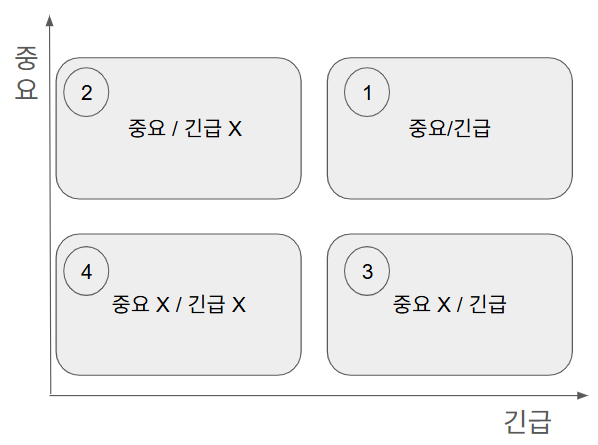 1. 긴급하고 중요한 일 (당장 하라) : 오늘 마감인 보고서, 응급 상황 대응