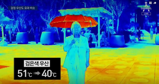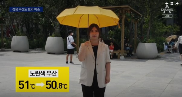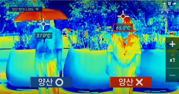 채널A 보도에 따르면, 한낮 기온 35℃의 서울 광화문 광장에서 열화상 카메라를 이용해 양산을 쓴 사람과 쓰지 않은 사람의 머리 온도를 비교한 결과, 15분 후 양산 착용자의 머리 표면 온도는 37℃, 미착용자는 65℃까지 상승하였다. 무려 28℃ 차이다.