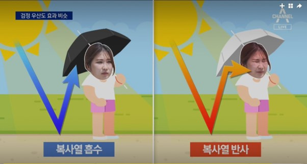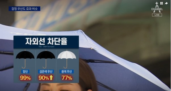 양산이 가장 효과적이지만, 없을 경우 검정색 또는 짙은 파란색 우산을 활용하는 것이 맨몸 노출보다 훨씬 나은 선택이다. 흰색, 노란색, 밝은 파란색 우산은 일정 부분 자외선을 차단하지만, 복사열 반사나 차단률 한계로 인해 실질적인 체감 효과는 크지 않다.