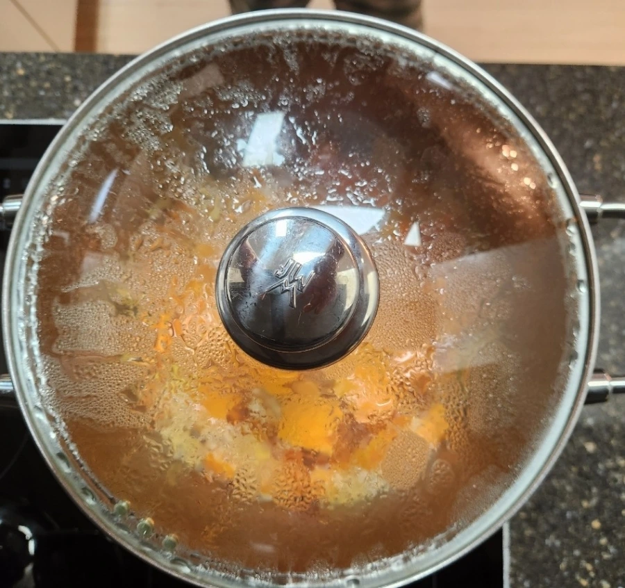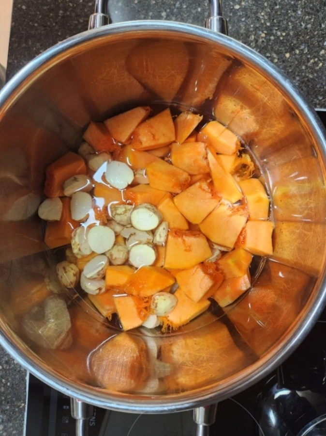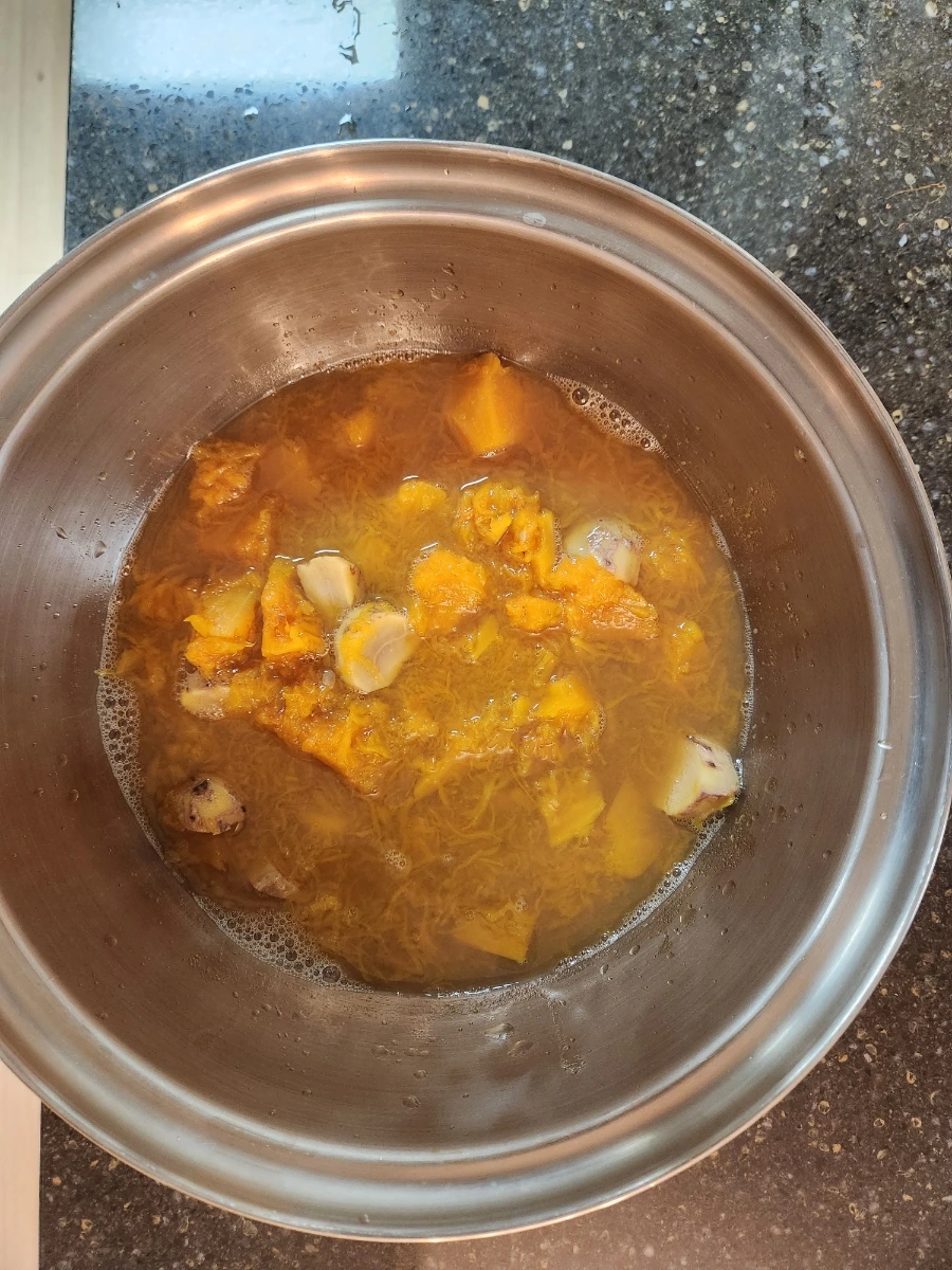 물을 1.2L 넣고, 강불로 호박과 밤을 삶다가 끓으면 중불로 해서 25분간 푹 삶는다. 5분 간격으로 저어주고, 거품을 걷어준다.