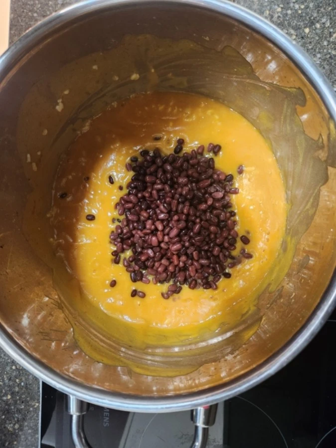 호박과 불린 찹쌀을 넣고 끓이다가 찹쌀이 익어가면 삶은 팥을 넣는다. 한번 끓고 나면 약불에서 15분간 끓인다(호박죽이 툭툭 튀어 손에 묻으면 정말 뜨겁습니다). 중간에 소금으로 간을 한다.
