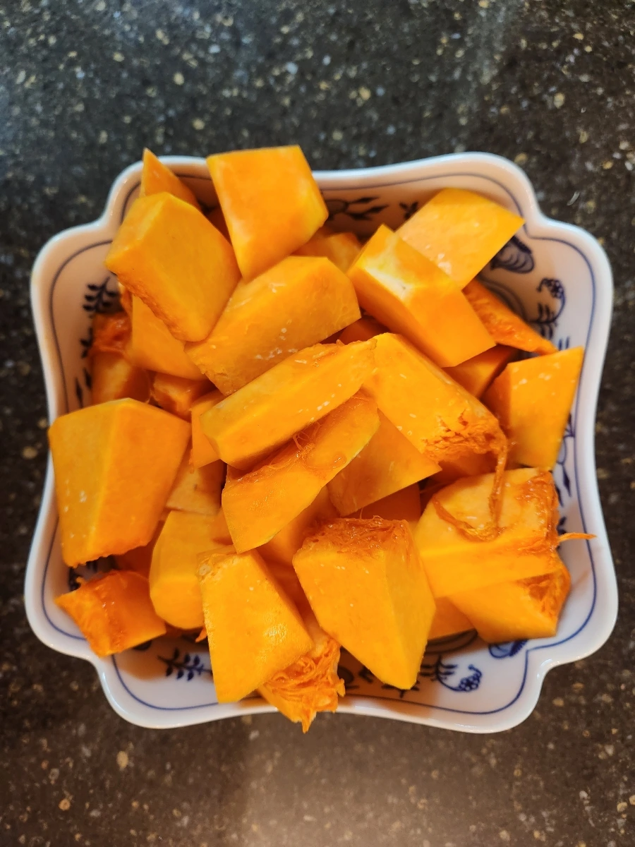 냄비에 물을 붓고, 잘게 썰어 둔 호박과 밤을 넣는다.