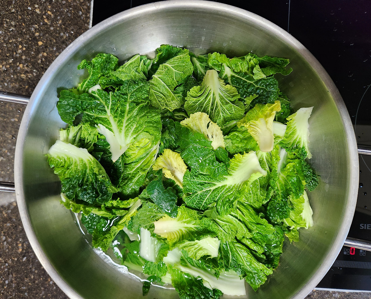 봄동을 손으로 찢어 육수가 있는 냄비에 넣는다.
