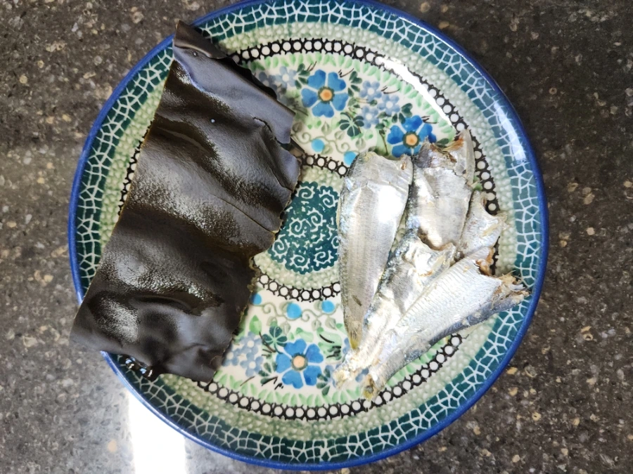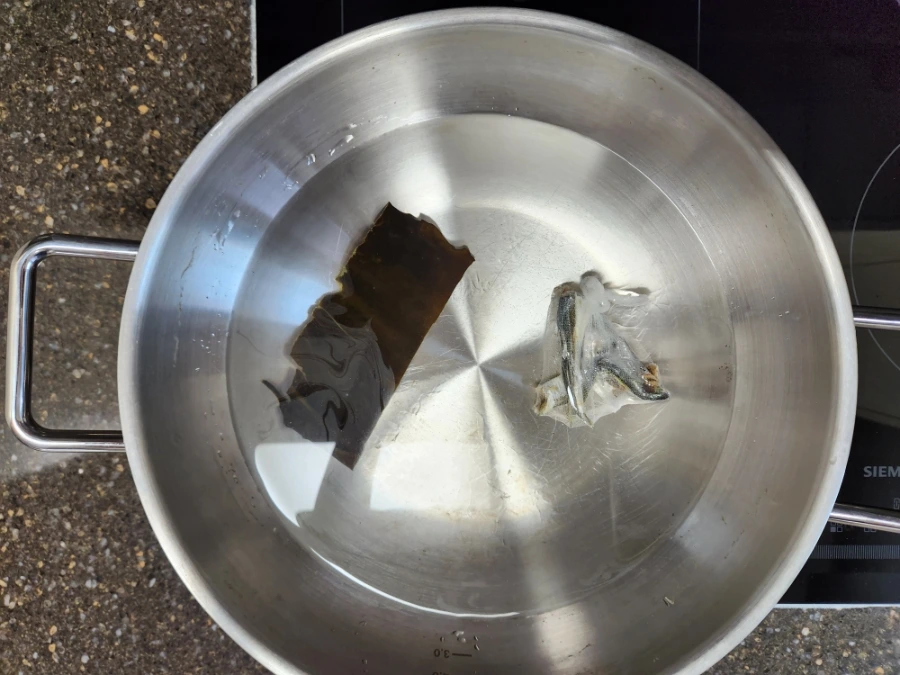 육수용으로 다시마 1장과 디포리 5마리(내장, 머리 제거)를 준비한다.