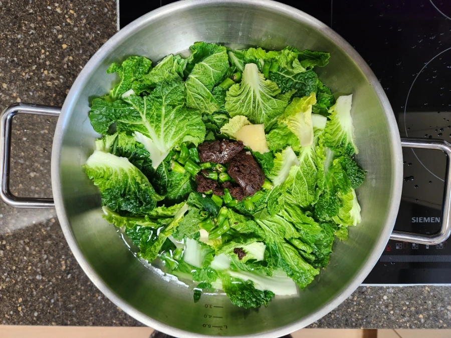 봄동 2 포기, 꽈리고추 5개, 홍고추 1개. 대파 1단, 집된장 3Ts, 다진마늘 1Ts, 육수 1.5L ( 다시마 10g, 디포리 5개 혹은 멸치 적당량, 물 1.5L )