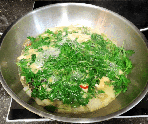쑥, 대파, 고추를 넣고 한 소끔 끓인다