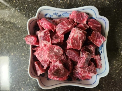 소고기를 키친타올로 핏물을 제거한 후 크게 썰어 준비한다(양과 크기는취향껏)