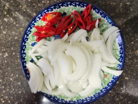 양파와 홍고추를 어슷 썰어 준비한다.