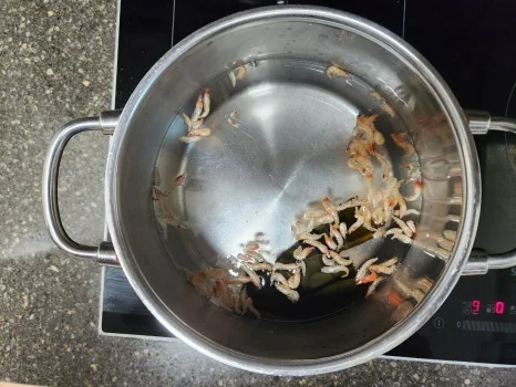 냄비에 보리새우를 넣고 볶다가 물 과 다시마를 넣는다. 끓으면 중불로 낮춘 후 10분 더 끓인다.