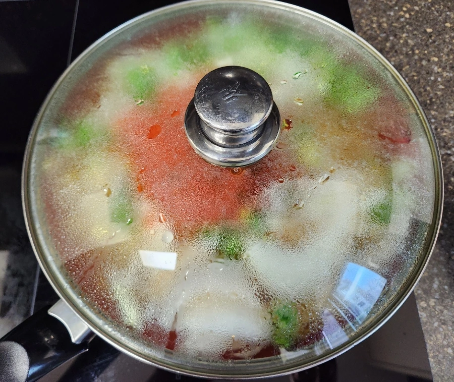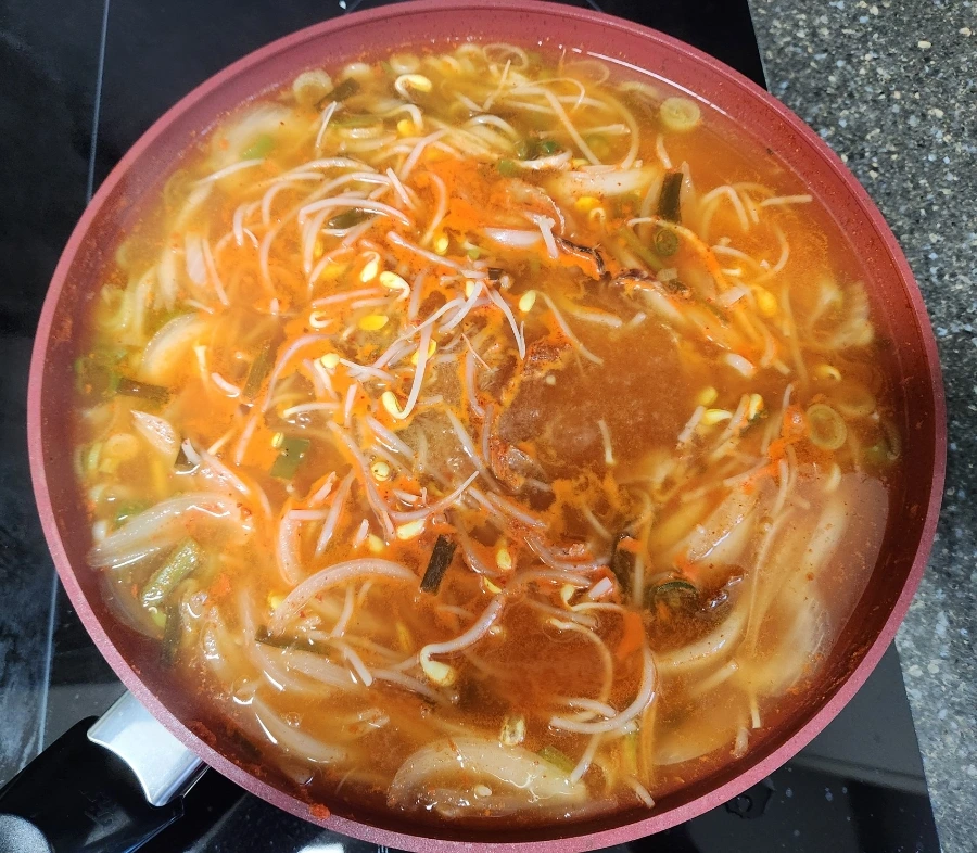 막상 냄비에 물을 올리고 김치 국물을 풀어 넣고, 콩나물을 한 움큼 얹어 끓이기 시작하니 생각보다 향부터 괜찮았다. 김치 국물 속에 배어 있는 마늘과 고춧가루, 젓갈의 깊은 맛이 은근히 국물에 스며드는 느낌이었다. 끓는 동안에도 ‘이게 정말 김치 없이도 성립이 될까’ 하는 궁금증은 계속 남아 있었다.