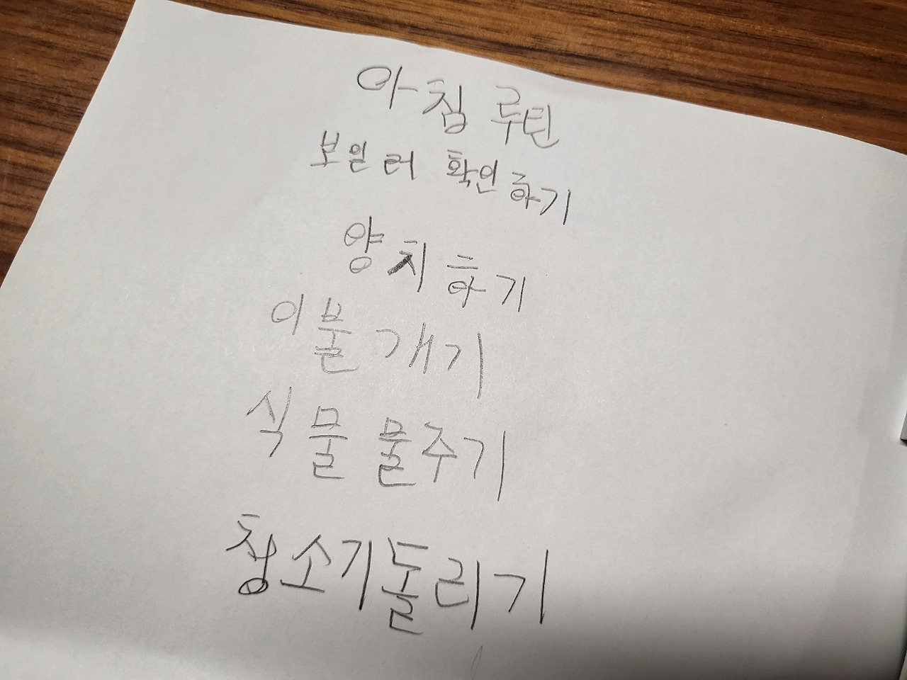 그날 아이가 적어 놓은 종이에는 아침루틴이 쓰여있었다.
