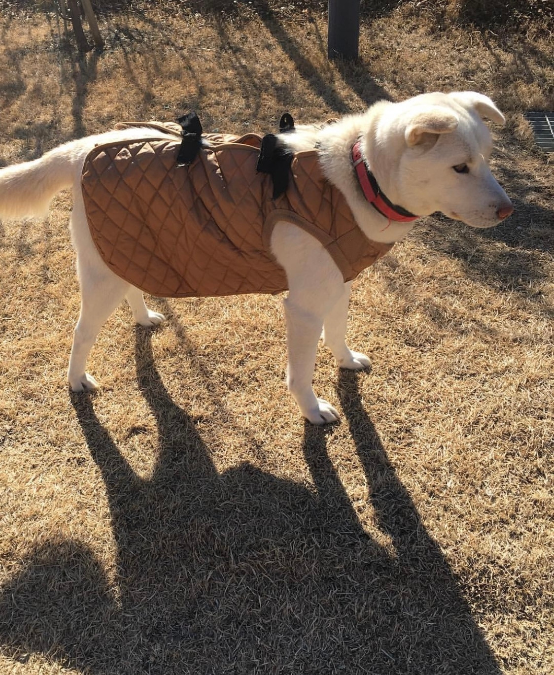 겨울이 되면 강아지들은 항상 송아지 방한복을 입는다. 사실 패딩처럼 따뜻하고 튼튼한 중대형견 옷들이 잘 없어 송아지 방한복을 찾아 입히기 시작했다.
