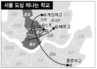 1945년 개교한 종로구의 풍문여고는 강남구의 보금자리 지구로 이사하였고, 1944년 개교한 계성여고는 성북구의 길음 뉴타운으로 이사하였다. 도심의 인구가 줄어 학생이 사라지니 학생이 있는 곳을 직접 찾아 떠난 것이다.