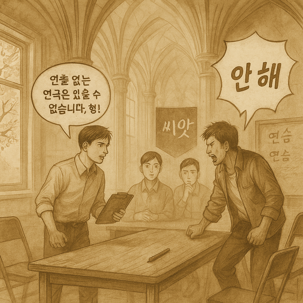 “J형 말대로 하면 정말 배우들이 더 창의적으로 변할지도 몰라. 그런데 연출 없이 배우들끼리 하려면 시간도 더 걸리고, 서로 싸울 수도 있어.”