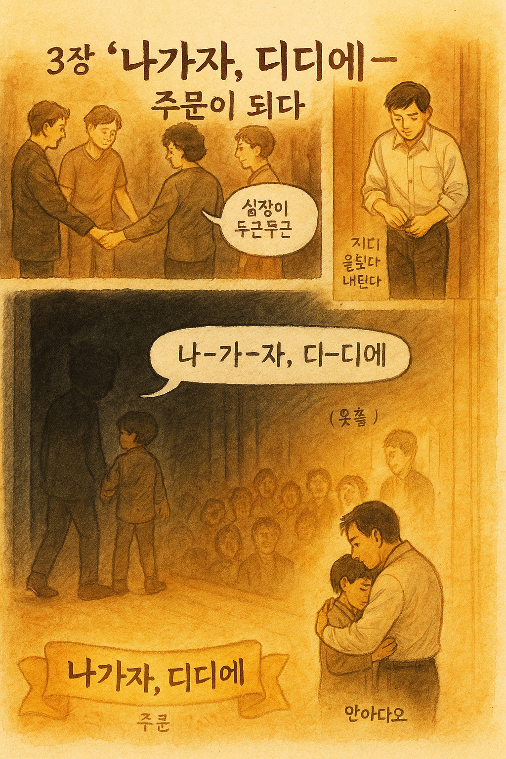 ‘나’를 내뱉고 한 박자 쉬었다. 그리고 ‘가자’를 천천히, 겁에 질린 사람처럼 띄엄띄엄 뱉었다. ‘디디에’라는 이름은 마치 아들을 지키려는 두뽕부의 간절함을 담아 떨리듯 뱉었다.